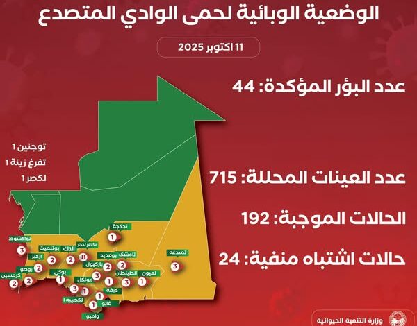 سجلت موريتانيا ارتفاعًا ملحوظًا في عدد بؤر حمى الوادي المتصدع، حيث بلغ إجمالي البؤر 44، موزعة على 22 مقاطعة تتبع لعشر ولايات. وأوضحت وزارة التنمية الحيوانية في بيان لها أن المصالح البيطرية المختصة قامت بتحليل 715 عينة، منها 192 عينة إيجابية، بينما تم استبعاد اشتباه 24 بؤرة.