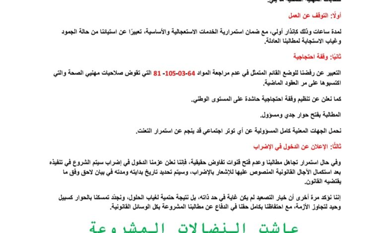 أعلن التحالف العام للنقابات المهنية الصحية عن تنفيذ توقف قصير عن العمل كخطوة إنذارية أولى، تمهيداً لإمكانية الإضراب العام، احتجاجاً على ما وصفه بتجاهل الجهات المعنية لمطالب المهنيين وتحسين أوضاعهم الاجتماعية والمهنية.