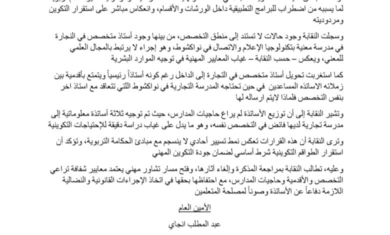 عبّرت النقابة الوطنية لأساتذة التعليم الفني والتكوين المهني عن رفضها لمذكرة التحويل الأخيرة، مطالبة بالتراجع عنها وفتح نقاش مهني يضمن اعتماد معايير واضحة تراعي التخصص والأقدمية واحتياجات المؤسسات.