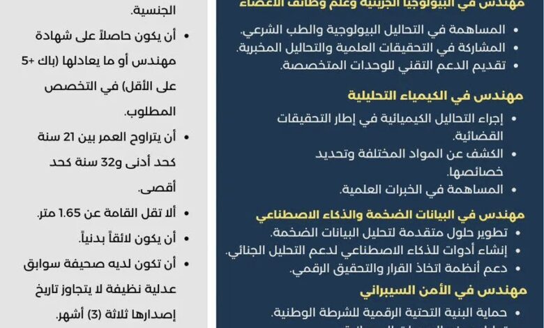 يشمل الاكتتاب تخصصات متعددة منها البيولوجيا الجزيئية وعلم وظائف الأعضاء، الكيمياء التحليلية، البيانات الضخمة والذكاء الاصطناعي، الأمن السيبراني، وتطوير التطبيقات الرقمية، بهدف دعم التحقيقات العلمية وحماية البنية الرقمية وتحسين الخدمات التقنية.