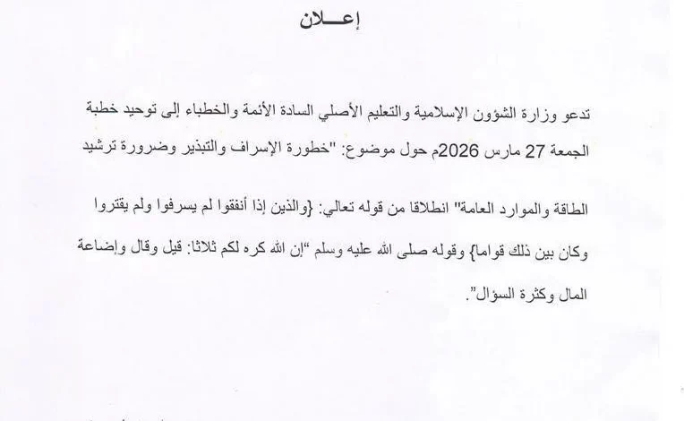 دعت وزارة الشؤون الإسلامية والتعليم الأصلي الأئمة والخطباء إلى توحيد خطبة الجمعة غداً تحت شعار “خطورة الإسراف والتبذير وضرورة ترشيد الطاقة والموارد العامة”.