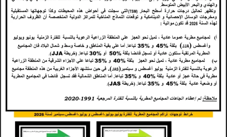 أفادت الهيئة الوطنية للأرصاد الجوية بأن التوقعات الأولية لموسم الأمطار الخريفية 2026 تشير إلى مجاميع مطرية عادية تميل إلى تسجيل عجز، خصوصاً في الحزام الزراعي الرعوي، مع تباين مرتقب في توزع التساقطات بين مختلف مناطق البلاد.