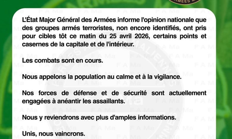 شهدت مالي فجر السبت هجمات منسقة استهدفت مواقع عسكرية ونقاطًا أمنية في العاصمة ومناطق داخلية، نفذتها مجموعات مسلحة لم تُحدد هويتها حتى الآن، وسط استمرار الاشتباكات في عدة مواقع.