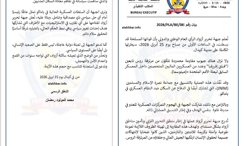 وفي سياق متصل، دعت الجبهة إلى تحرك دولي عاجل لمواجهة الأوضاع الإنسانية والسياسية المتدهورة في أزواد، مشيرة إلى أن السكان يعانون من انعدام الأمن والتهميش. كما أكدت أن عمليتها في كيدال تمت بالتنسيق مع جماعة نصرة الإسلام والمسلمين، بالتزامن مع هجمات استهدفت مواقع عسكرية في مدينة غاو ضمن نفس الإطار العملياتي.