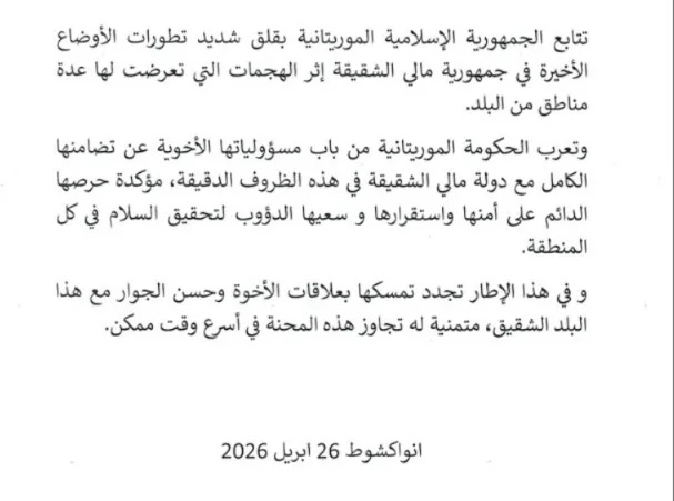 أعربت موريتانيا عن قلقها البالغ إزاء التطورات الأمنية الأخيرة في مالي، عقب الهجمات التي استهدفت عدة مناطق من البلاد.